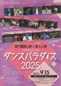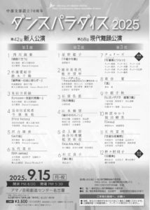 ダンスパラダイス2025 2025年9月20日 9/15(祝) 18:00〜 アマノ芸術創造センター名古屋にて、ダンスパラダイスが開催されます。 DWこかチからは、 新人公演 杉浦愛結奈&鈴木千翔作品と五代菜月作品 現代舞踊公演 五代菜月作品 今回、鈴木千翔が初新人公演。また、長田真希が高校生になり、現代舞踊公演にデビューします。タイトな時間の中、よい作品になるようにダンサーたちが頑張っています。 お時間ありましたら、ぜひお越しください。